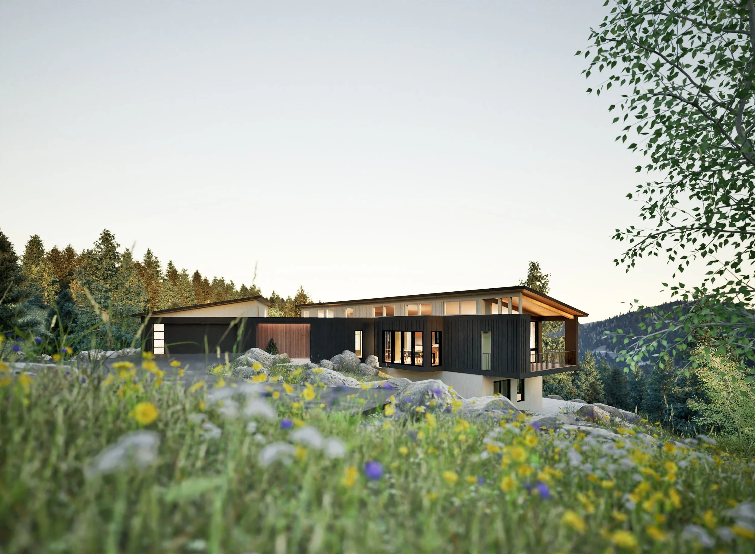 Explore a low-slung design that melds seamlessly into Colorado's Black Forest landscape, combining passive design strategies with advanced materials like 3D-printed concrete and cross-laminated timber to achieve both aesthetic appeal and environmental harmony, all while framing the surrounding Ponderosa Pine groves.